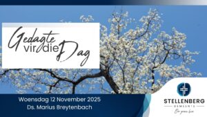 “Die vrug van die Gees, daarenteen, is liefde, vreugde, vrede, geduld, goedhartigheid, getrouheid, nederigheid en selfbeheersing. Ons lewe deur die Gees; laat die Gees nou ook ons gedrag bepaal.”